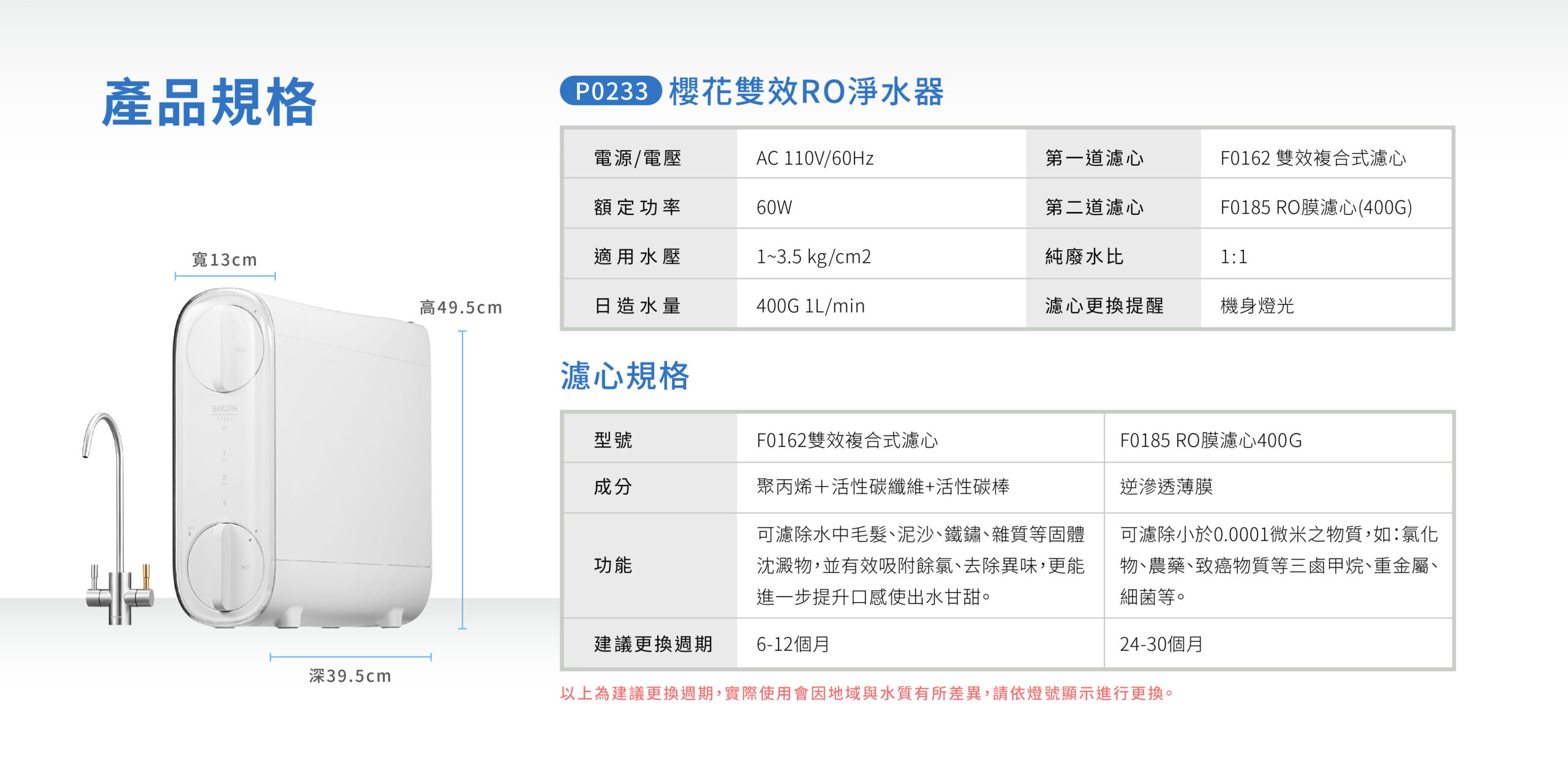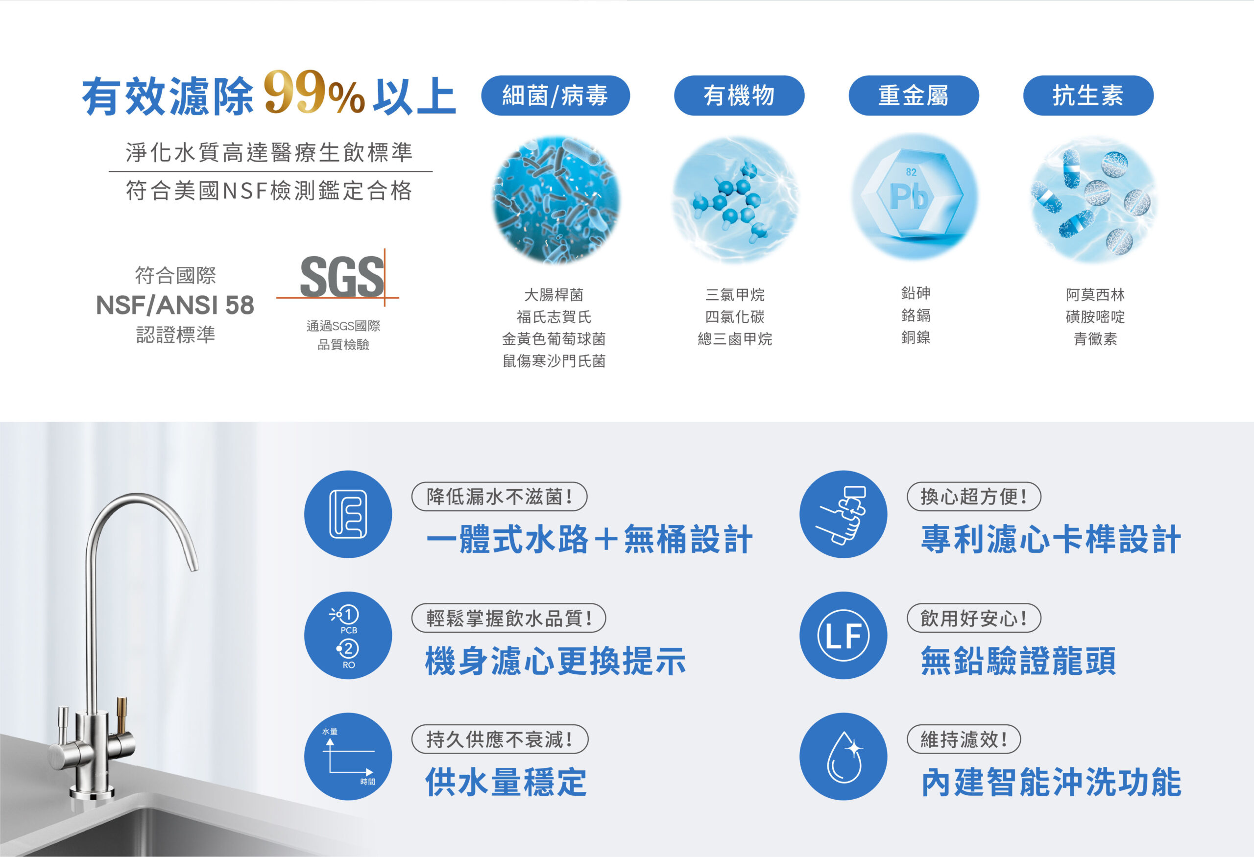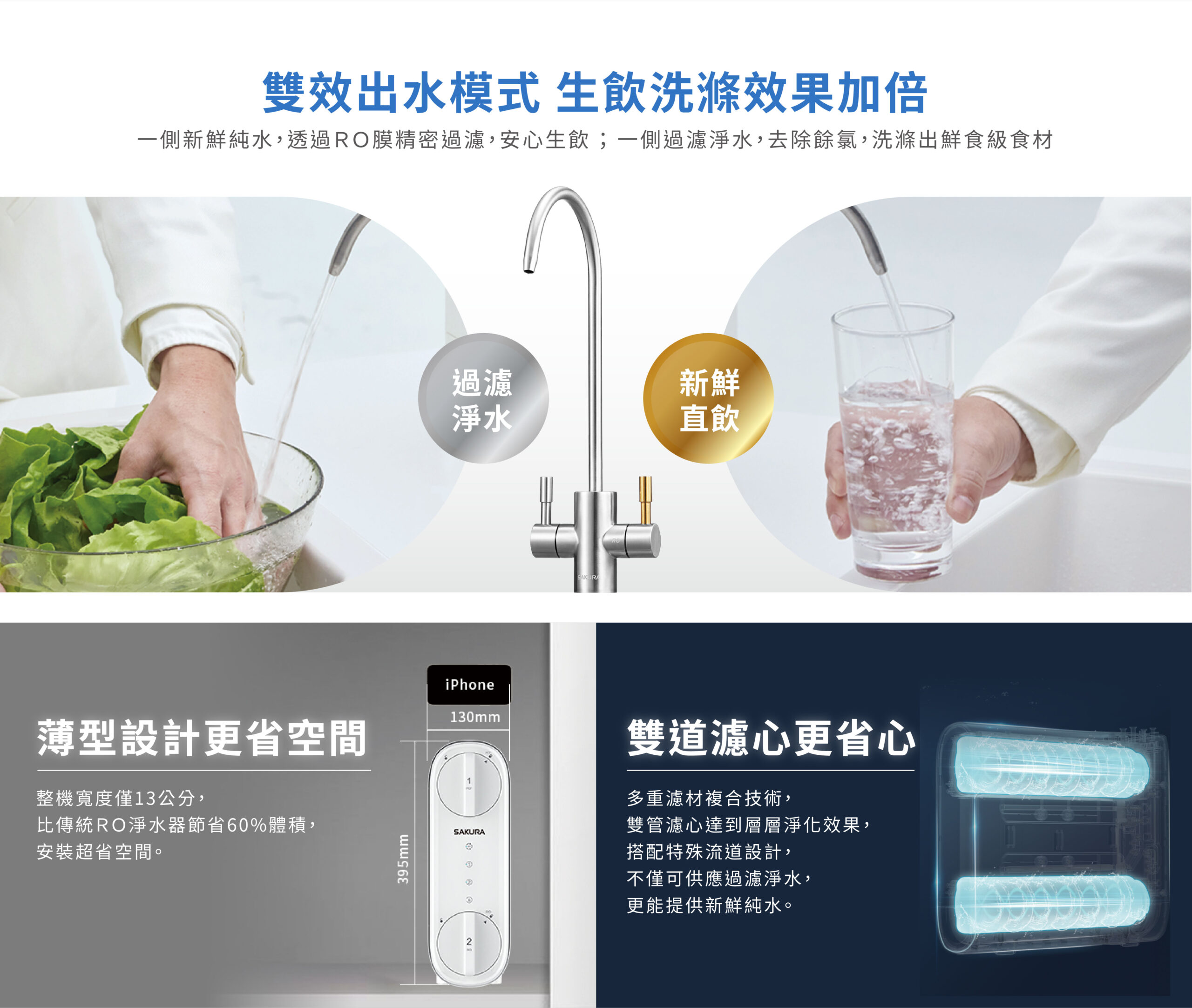 ● 榮獲2022金點設計獎 ● 雙濾心設計,機身更輕薄,更省空間 ● 雙出水模式,可依需求選擇純水生飲或過濾水洗滌 ● 一體式水路設計,降低漏水風險 ● 無儲水桶設計,省空間杜絕污染 ● 內建智能沖洗、手動沖洗功能,維持濾效