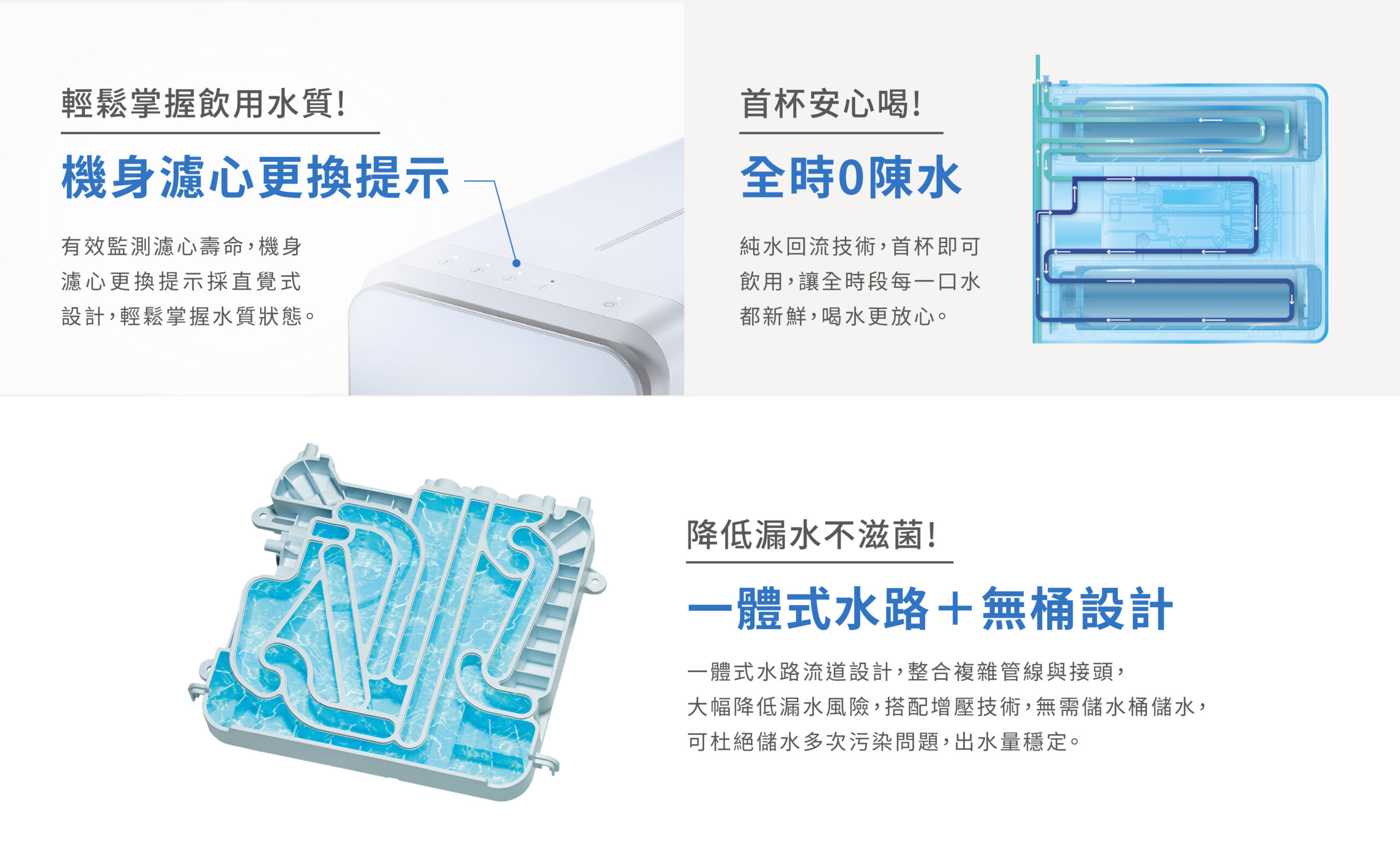 ● 設計榮獲國際iF設計大獎肯定 ● 日造水量400加侖,1L/分 ● 純水回流技術,全時段每一口都新鮮 ● 一體式水路設計,降低漏水風險 ● 無儲水桶設計,省空間杜絕污染