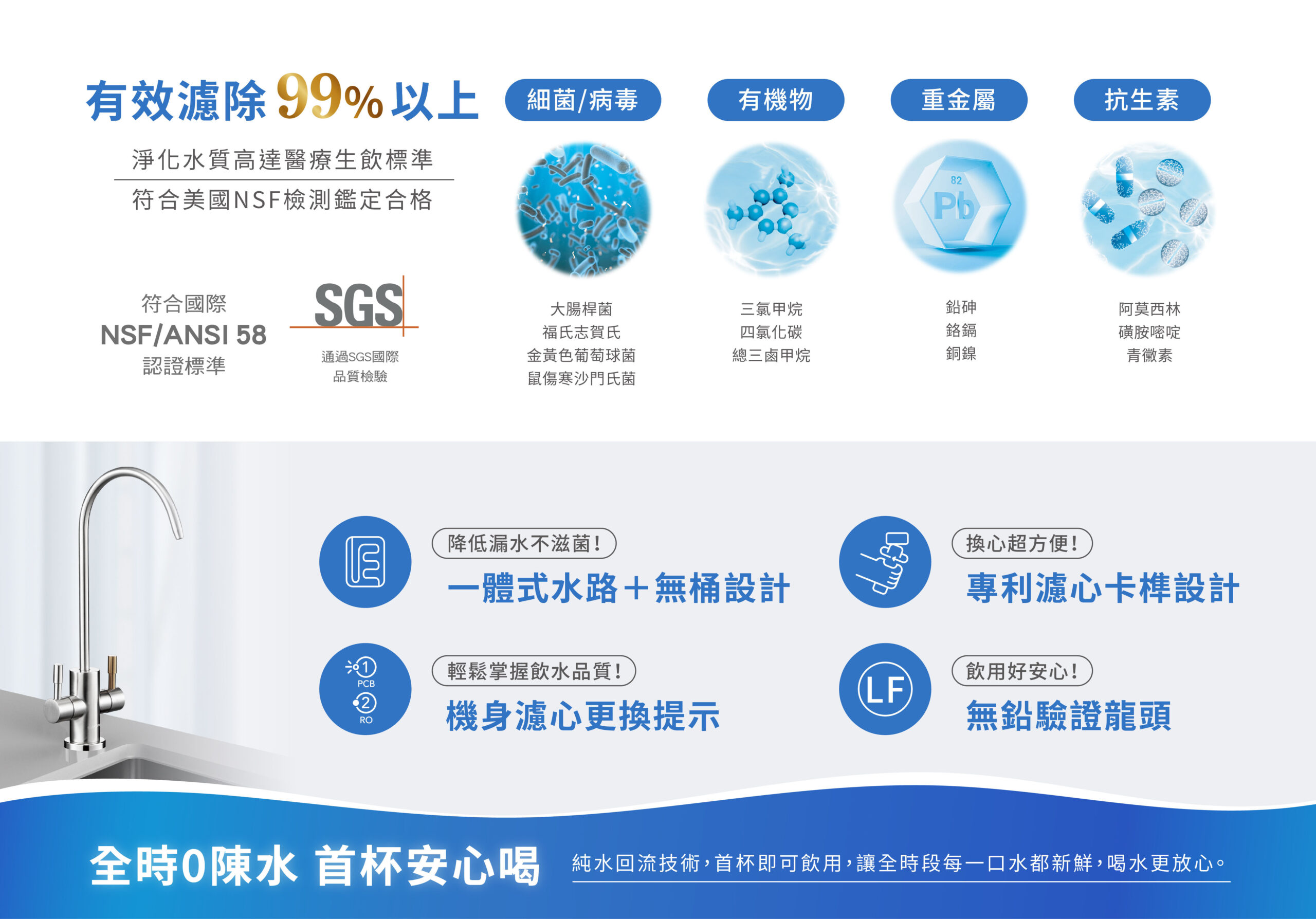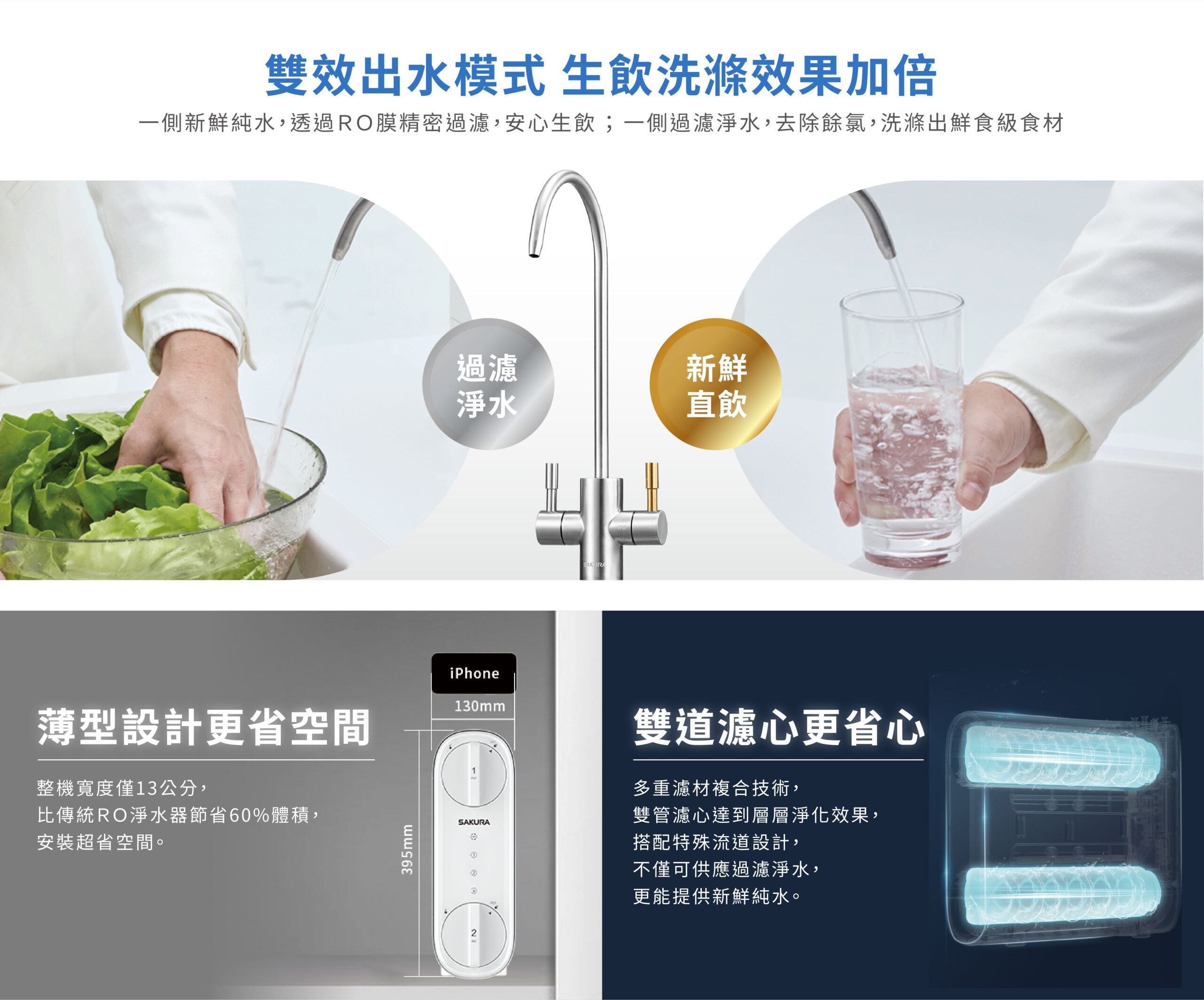 ● 雙出水模式,可依需求選擇純水生飲或過濾水洗滌 ● 雙濾芯設計,機身更輕薄,更省空間 ● 日造水量400加侖,1L/分 ● 純水回流技術,全時段每一口都新鮮 ● 一體式水路設計,降低漏水風險
