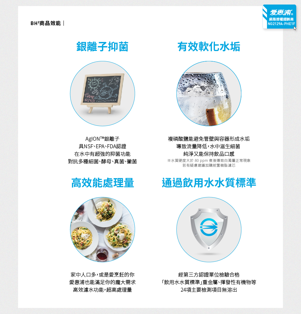 ● AgION銀離子:擁有NSF、EPA、FDA認證的銀離子,對人類無害 更在水中有超強的抑菌功能,能對抗水中多種類型的細菌、酵母、真菌、黴菌等