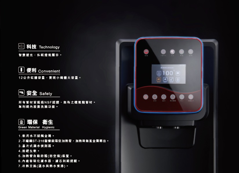 ● 飲用水不接觸金屬 ● 晶片式漏水偵測器 ● 專利機內殺菌洗滌功能 ● 智慧燈光,休眠燈條顯示 ● 冷熱交換(溫水與熱水煮沸) ● 加熱管自動防護(防空燒)裝置 ● 通過NSF認證,無毒之鐵氟龍管材 ● 內建客製化濾水器,濾芯到期提醒 ● 不鏽鋼ST-316醫療級環型加熱管,加熱時無重金屬釋出