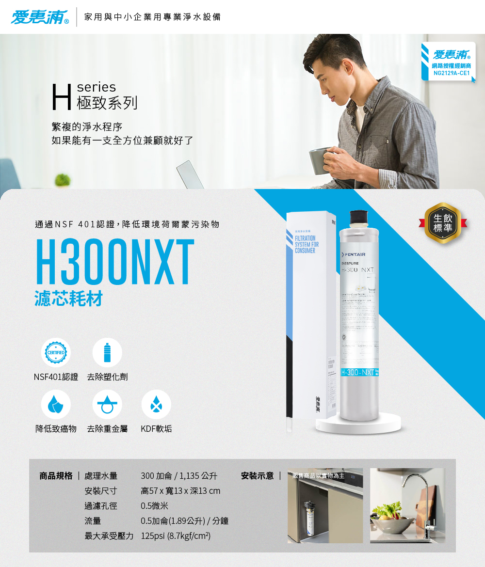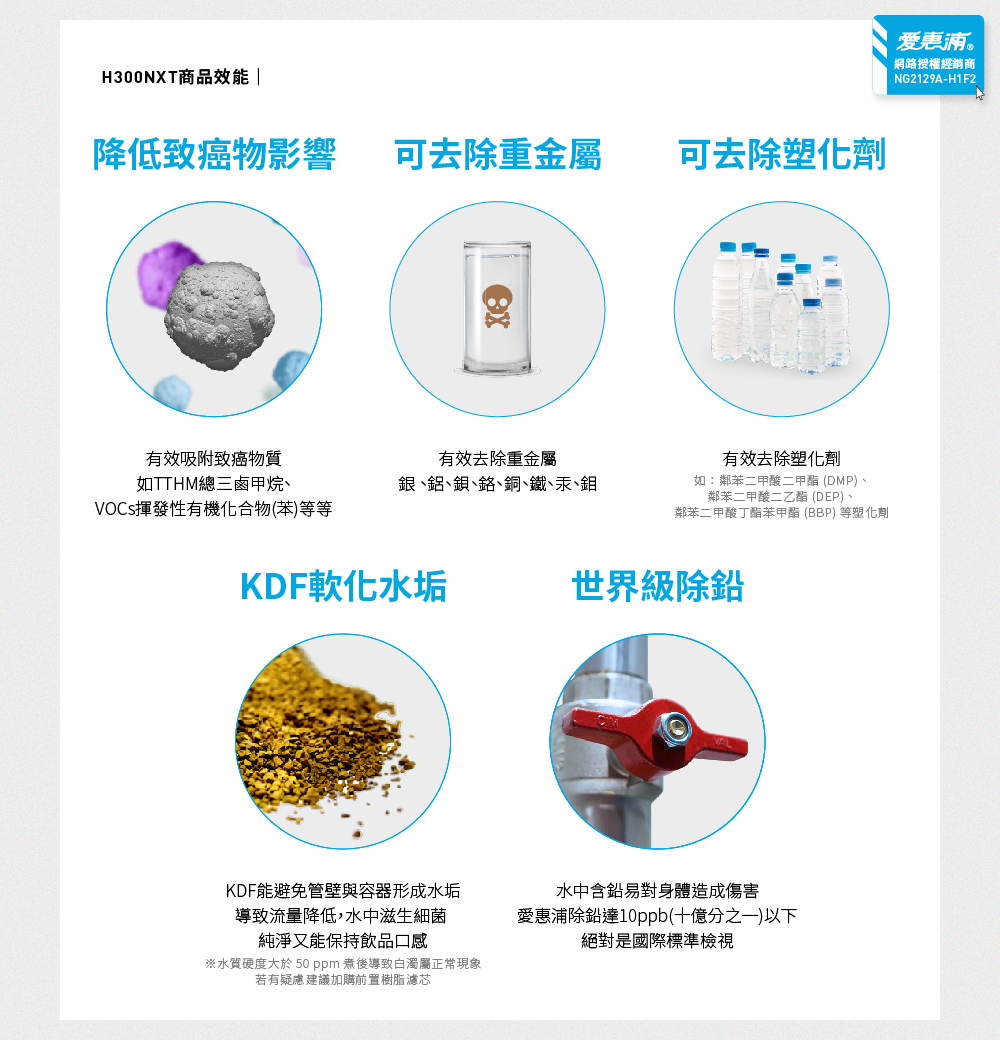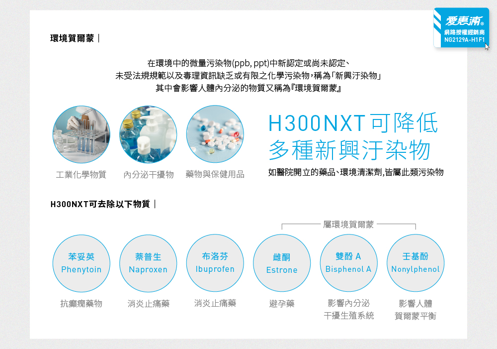 ● 通過NSF/ANSI 401認證:可降低水中多種新興汙染物,例如:雙酚A(Bisphenol A)、壬基酚(Nonylphenol)、苯妥英(Phenytoin)、布洛芬(Ibuprofen)、萘普生(Naproxen)、雌性激素(Estrone)等