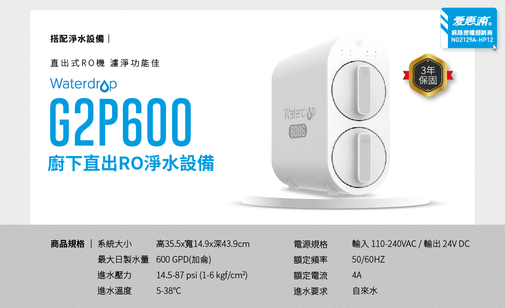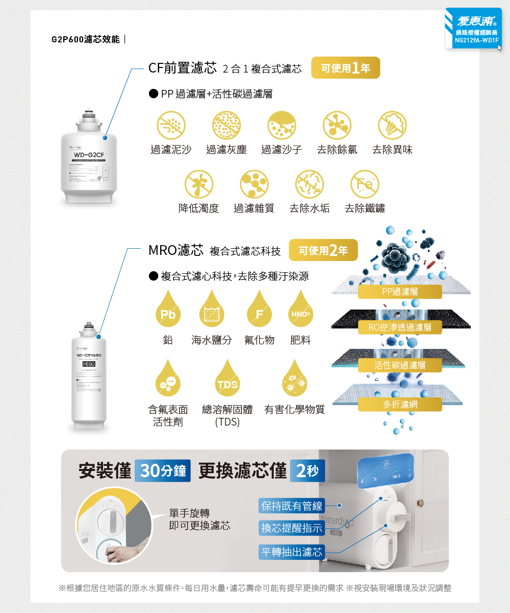 ● 僅兩道濾心,設備2年換3支濾心,省時省錢