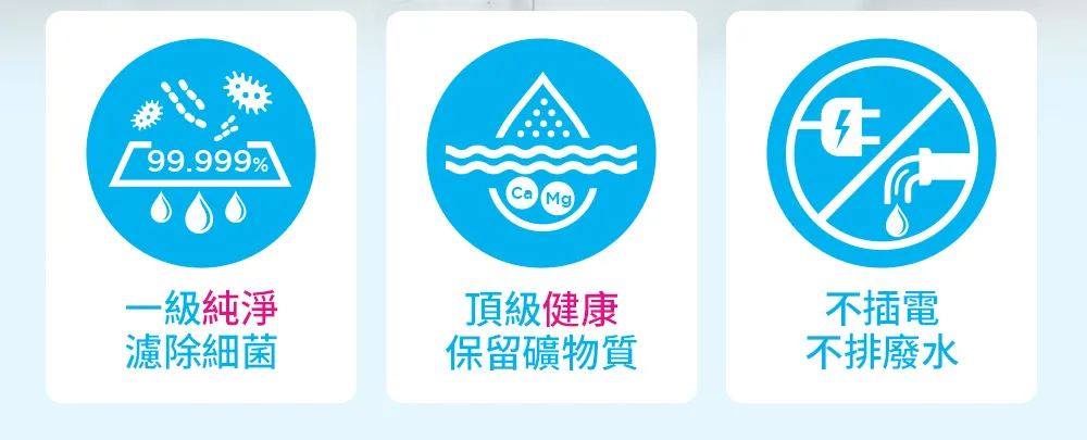 ● 超越RO 一級純淨: 使用德國精品級中空絲膜,濾除細菌,同時保留有益礦物質,在安全、健康、口感三方面完全滿足需求。