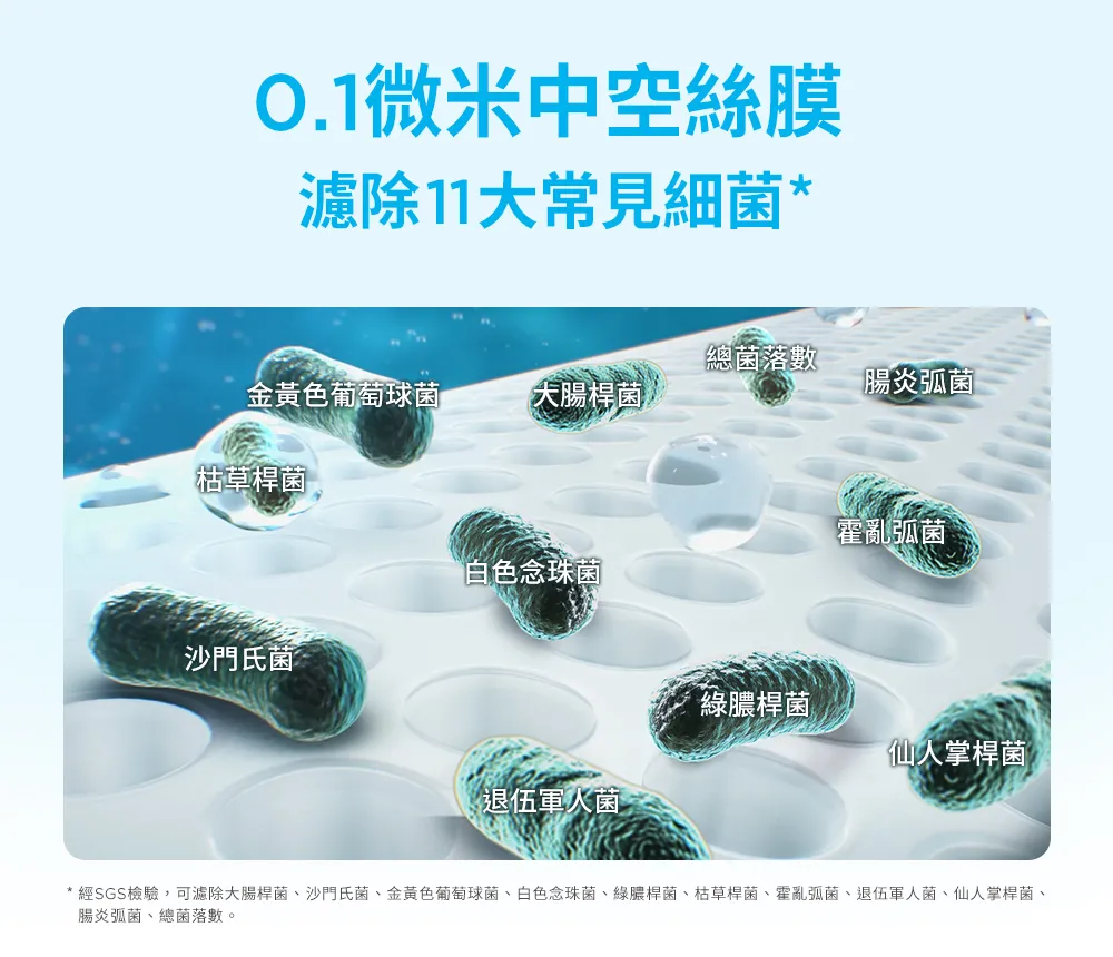 ● 德國精品級過濾精度0.1微米中空絲膜: 濾除99.999%的細菌、11種常見細菌、15種劇毒農藥、8種重金屬、6種有機汙染物、4種新興汙染物。