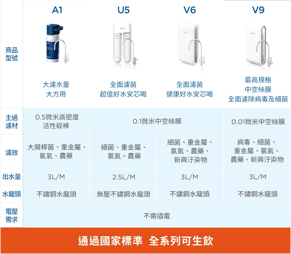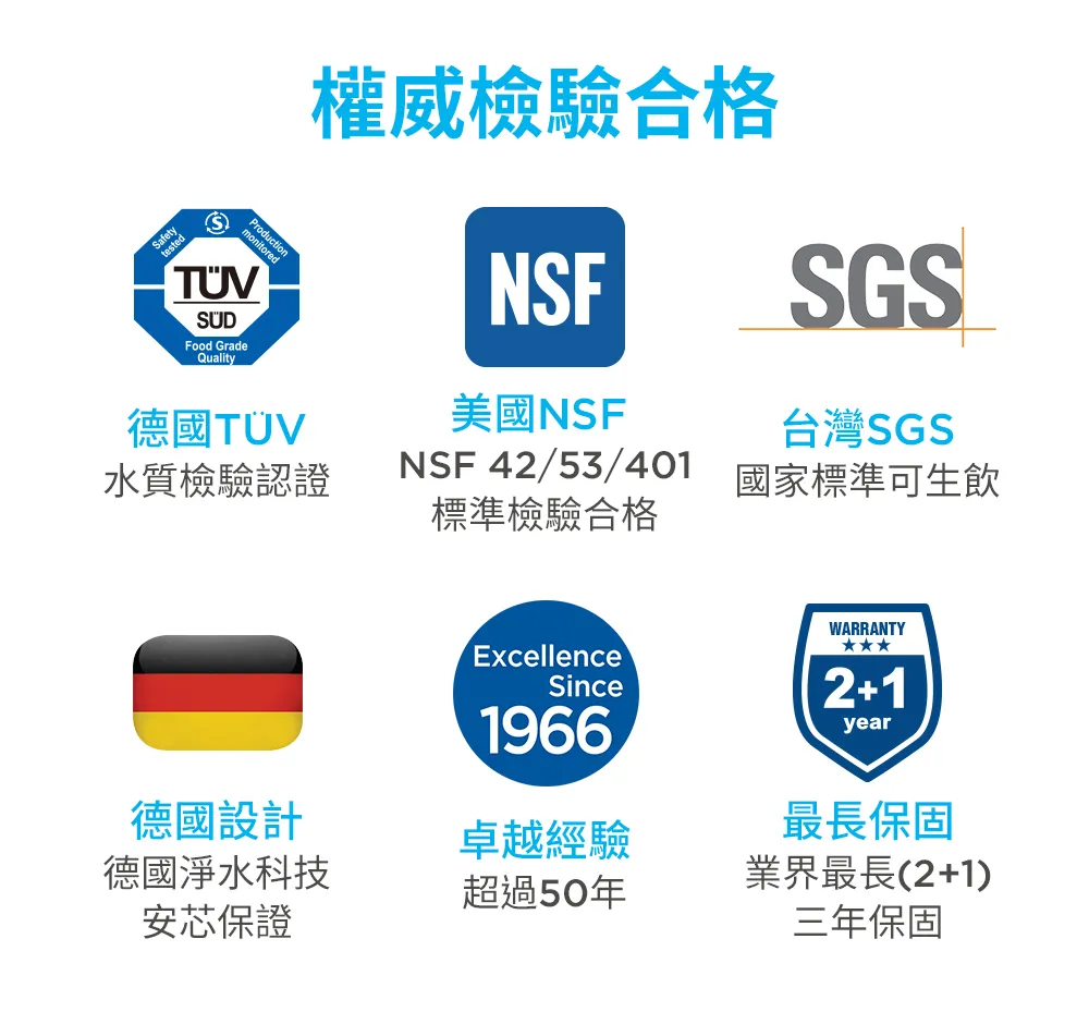 ● 經NSF 42/53/401標準檢驗合格,台灣SGS檢驗符合國家標準可生飲