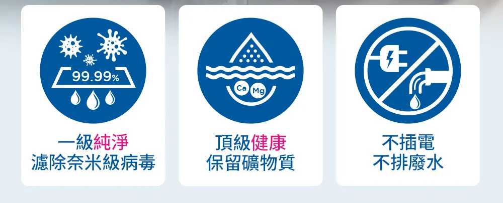 ● 超越RO 一級純淨: 使用業界最頂級中空絲膜,濾除病毒,同時保留有益礦物質,在安全、健康、口感三方面完全滿足需求。