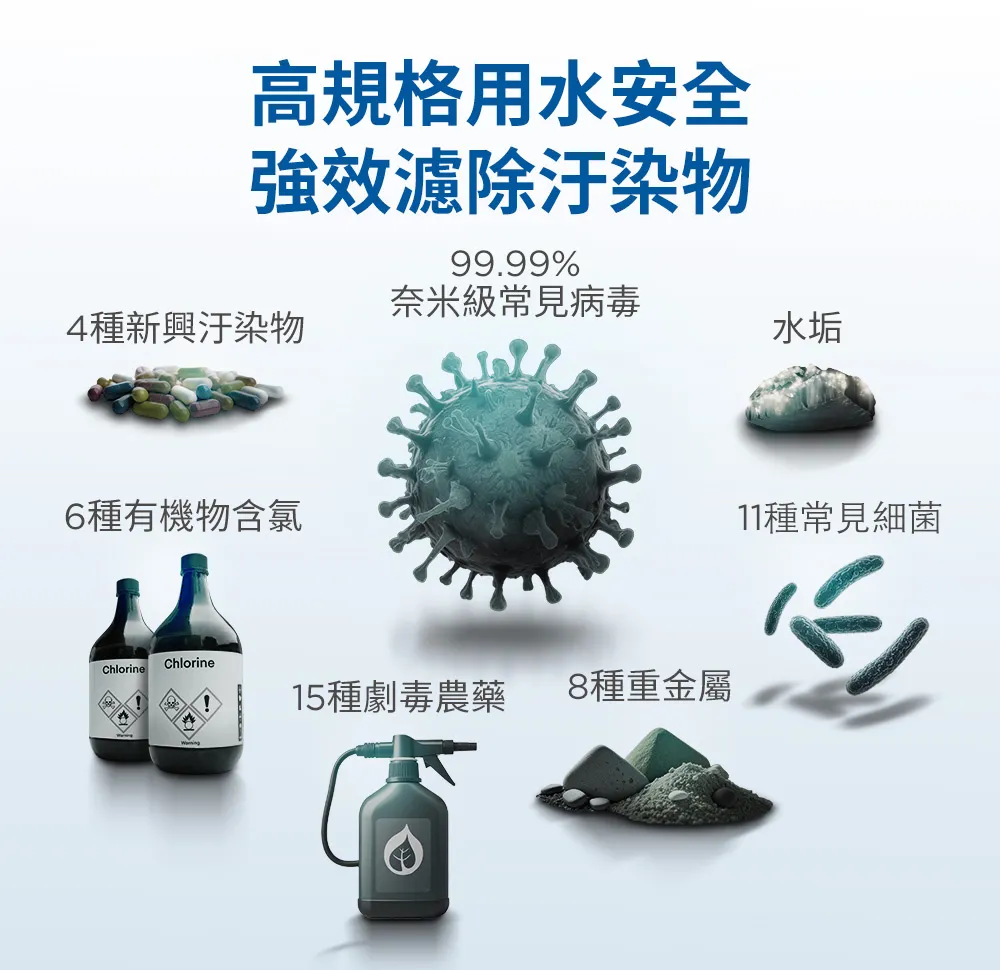 ● 德國精品級過濾精度0.01微米中空絲膜: 濾除99.99%病毒、99.9999%的細菌、11種常見細菌、15種劇毒農藥、8種重金屬、6種有機汙染物、4種新興汙染物。