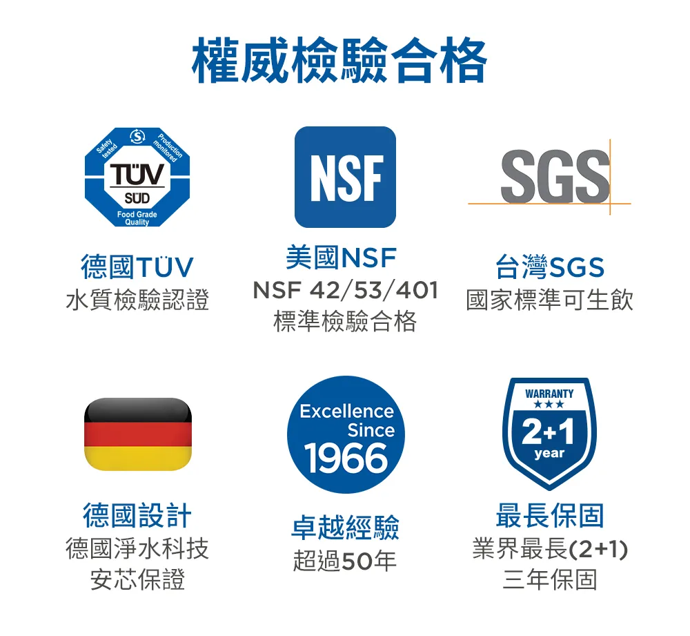 ● 經NSF 42/53/401標準檢驗合格,台灣SGS檢驗符合國家標準可生飲