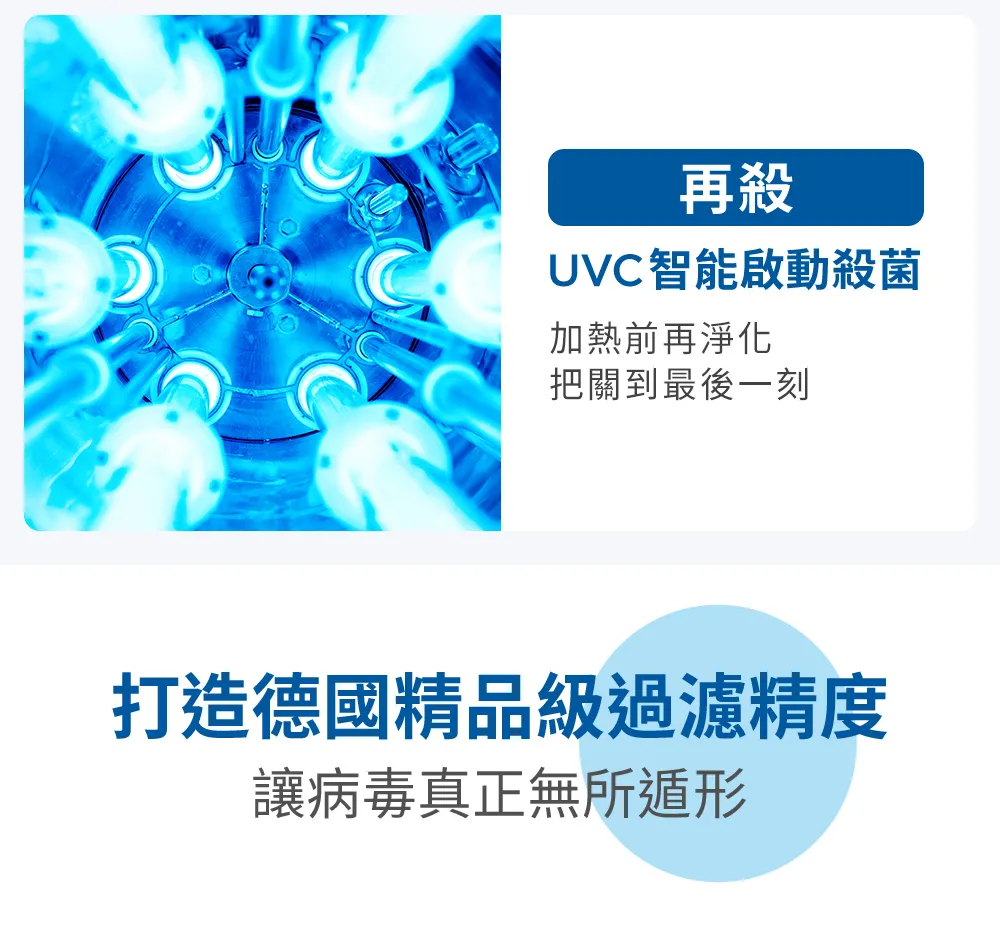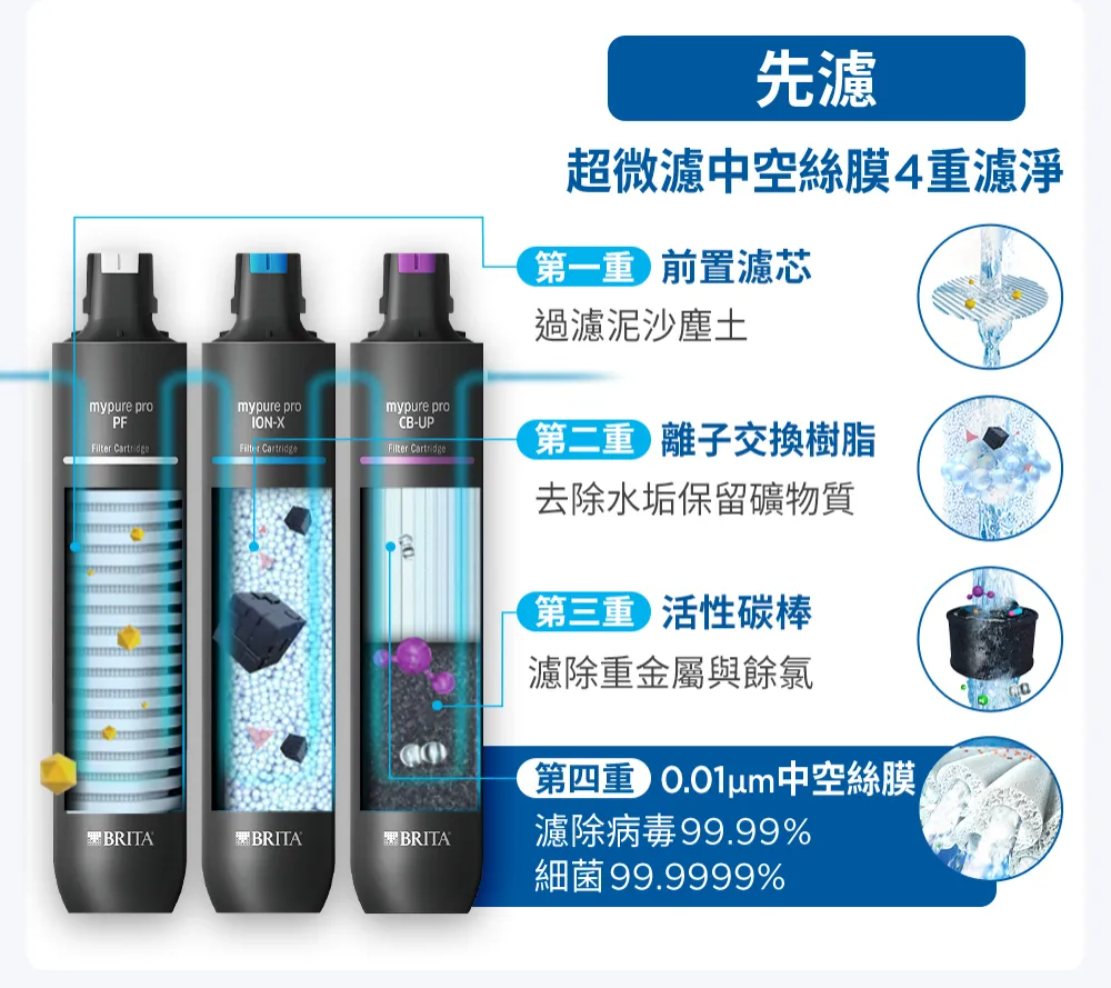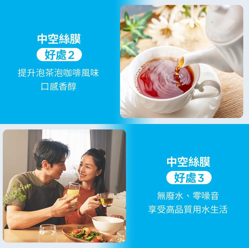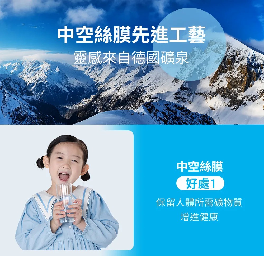 ● 超越RO 一級純淨:使用德國精品級中空絲膜,濾除99.99%病毒、99.9999%的細菌,同時保留有益礦物質