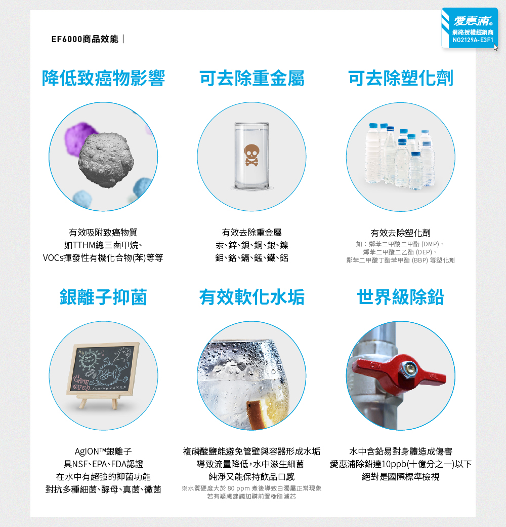 ● 多效合一,兼備除鉛、軟垢、銀離子抗菌,還可去除塑化劑、重金屬等有害物質,有效吸附TTHM總三鹵甲烷、VOCs揮發性有機化合物(苯)等致癌物質