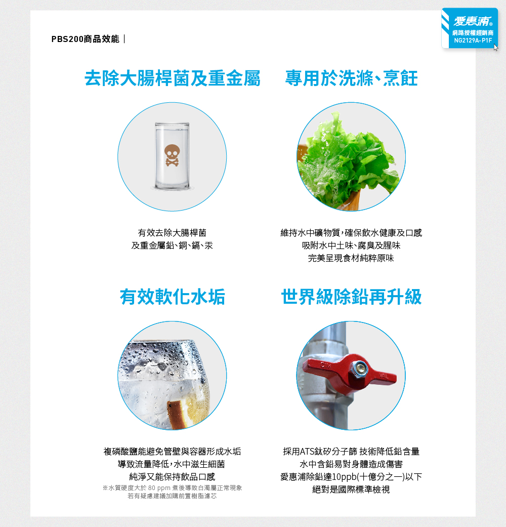 ● PBS200濾芯可去除重金屬鉛、銅、鎘、汞及大腸桿菌 *報告來源為SGS實驗室檢測