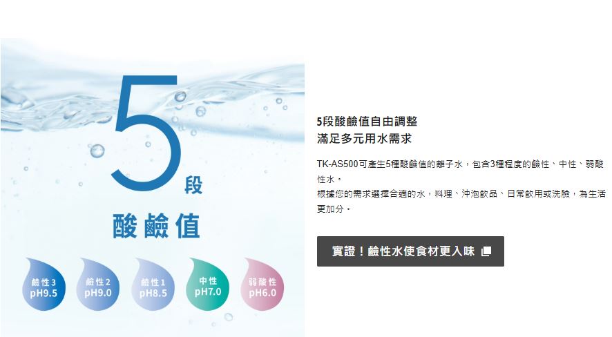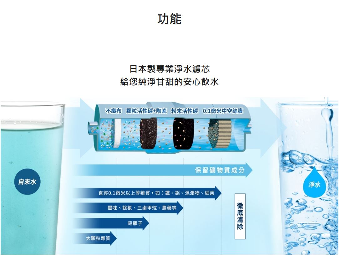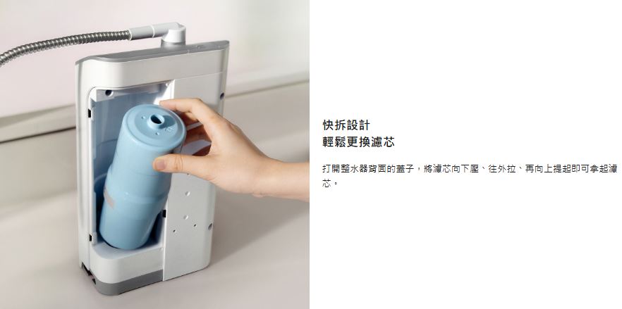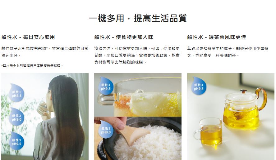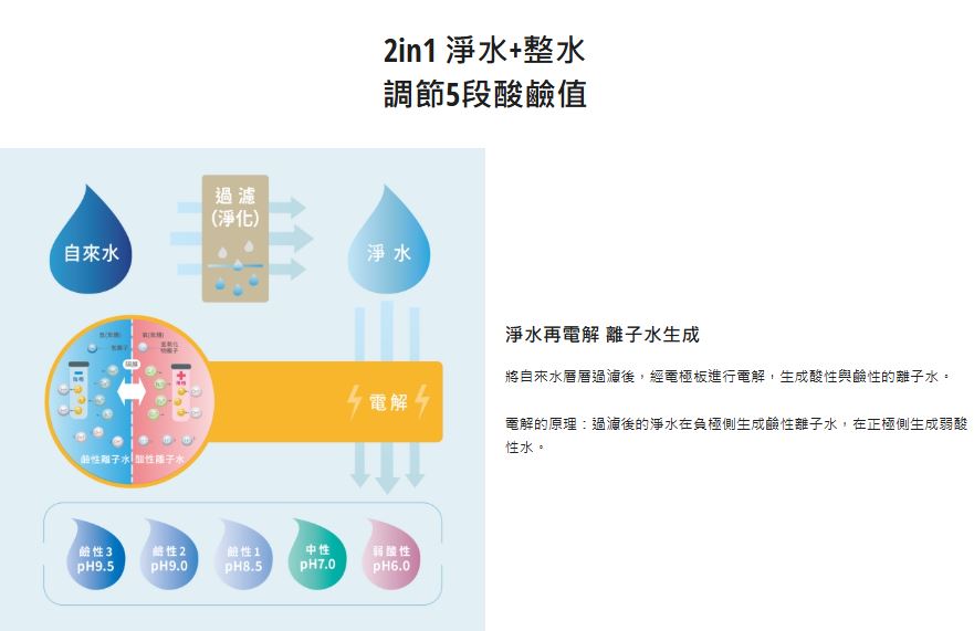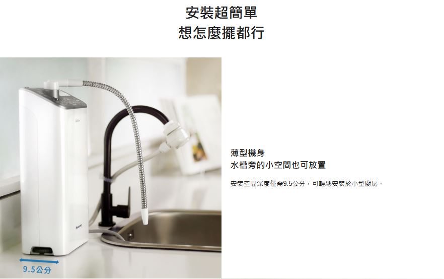 ● 日本原裝進口,台灣水質專用 ● 符合日本JIS、JWPA標準及國家BSMI認證 ● 可過濾鉛、多種有害物質及致癌物質、細菌 ● 3枚電極電解槽,5段酸鹼值設定 ● 薄型化簡約設計